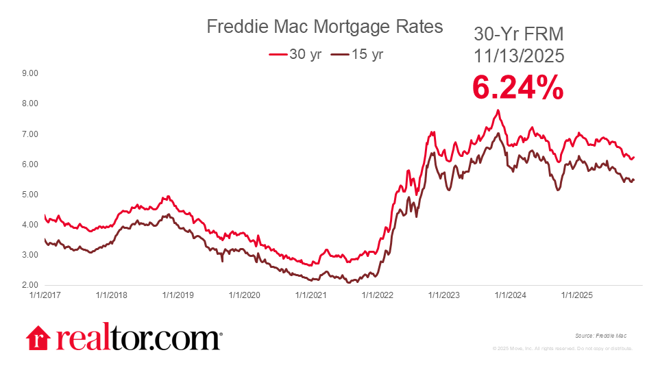 The Freddie Mac 30-year fixed mortgage rate essentially held steady this week, averaging 6.24%, only slightly above last week’s 6.22% and well below the 6.78% a year ago. This near-flat movement reflects a broader market pause, as sentiment surrounding the government’s reopening is tempered by lingering fiscal and economic uncertainty. While the 10-year Treasury yield has shown signs of stabilizing, there is still no meaningful catalyst to push rates decisively higher or lower. The Federal Reserve’s repeated reminder that “policy is not on a preset course” is already well understood and priced in. With no official jobs report or key data releases during the shutdown, markets are operating in an information vacuum that reinforces this holding pattern.