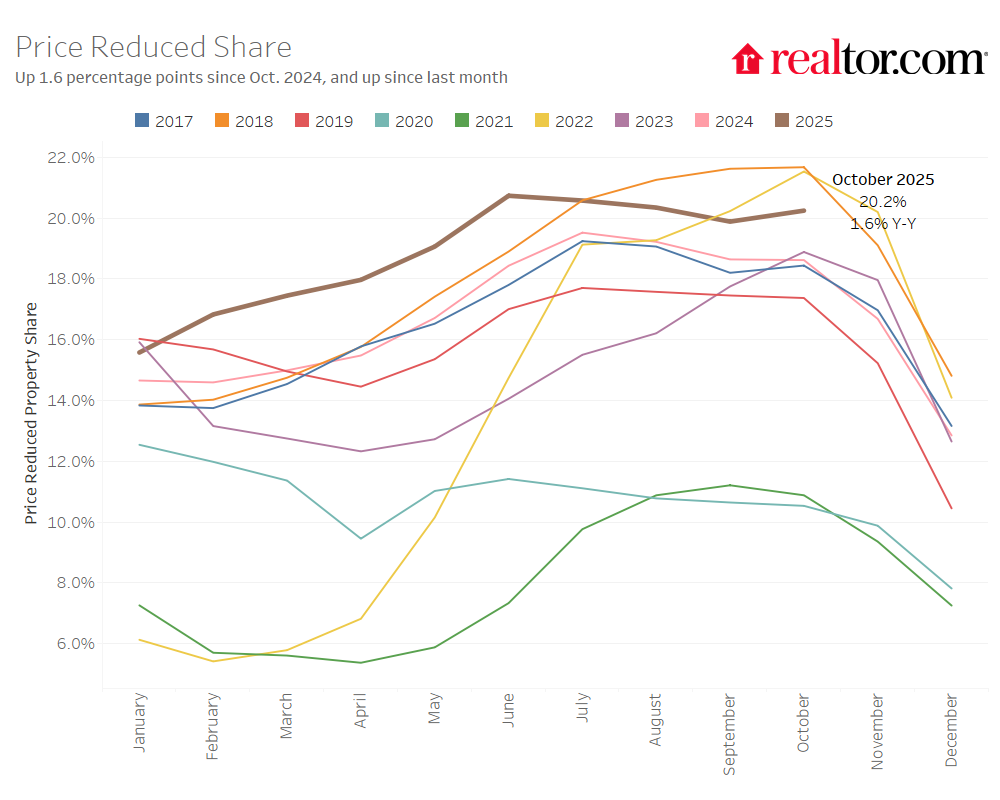 Turning back to the national picture, price cuts continue to be a key feature of the 2025 market, even as median list prices edged up slightly. In October, 20.2% of home listings had price reductions—up a modest 1.6 percentage points from last year, and up slightly since last month.