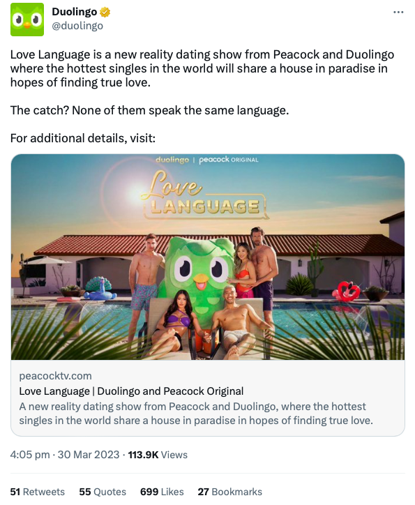 Duolingo and Peacock had இந்த ஆண்டின் சிறந்த ஏப்ரல் முட்டாள் தின பிரச்சாரம். லவ் லாங்குவேஜ் என்பது லவ் ஐலேண்ட் போன்ற பிரபலமான ரியாலிட்டி ஷோக்களைப் பிரதிபலிக்கும் ஒரு போலி தொலைக்காட்சி நிகழ்ச்சி கருத்தாகும். இந்த ரியாலிட்டி ஷோ கான்செப்ட் அவர்களின் பார்வையாளர்கள் உண்மையாகவே வெளியேறி, அதன் தயாரிப்பை யதார்த்தமாக்கும்படி கேட்டுக் கொண்டது.