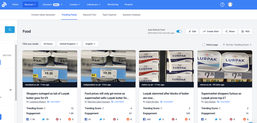TL;DR: ரைஸ் அட் செவன் BuzzSumo ஐப் பயன்படுத்தி, வெண்ணெய் பிராண்ட் அதிக விலை காரணமாக பிரபலமடைந்து வருகிறது. அவர்கள் தங்கள் மளிகைக் கடை வாடிக்கையாளருடன் இணைந்து, வெண்ணெய் இலவசமாக வழங்குவதற்காகப் பணிபுரிந்தனர், மேலும் பல சிறந்த செய்தி வெளியீடுகளில் கவரேஜைப் பெற்றனர்.