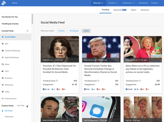 BuzzSumo இதற்கு BuzzSumo Trending எனப்படும் சிறந்த கருவியைக் கொண்டுள்ளது. உங்கள் இலக்கு வெளியீட்டாளர்களைச் சுற்றி தனிப்பயன் ஊட்டத்தை விரைவாக உள்ளமைக்கலாம், மேலும் அவர்களின் எந்த உள்ளடக்கம் சமூகத்தில் வேகம் பெறுகிறது என்பதைப் பார்க்கலாம்.