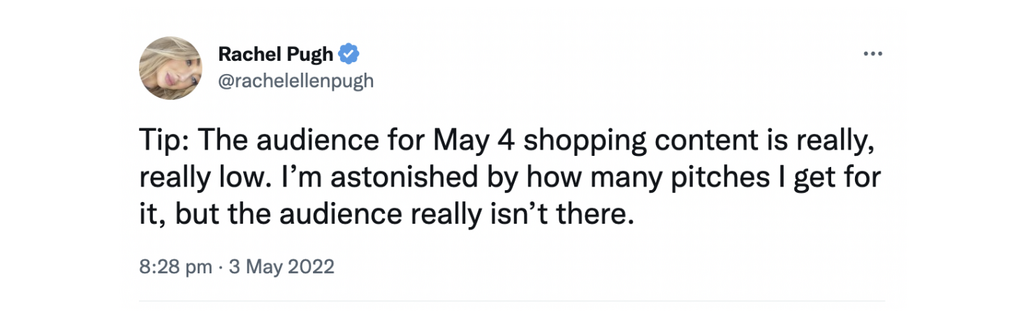 இதுபற்றிய ஒரு சிறந்த கருத்து, 2022 இல் பத்திரிகையாளர் ரேச்சல் புக் விளக்கினார், அவர் தனிப்பட்ட முறையில் நாம் என்ன நினைத்தாலும் மே 4 ஷாப்பிங் உள்ளடக்கத்திற்கு உண்மையில் பெரிய பசி இல்லை என்று விளக்கினார்.