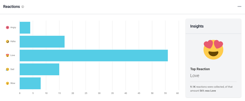 BuzzSumo இன் உள்ளடக்க பகுப்பாய்வு தாவல் அறிக்கையில் உள்ள முகநூல் எதிர்வினைகள் விளக்கப்படம், பூமி தினத்தைச் சுற்றியுள்ள பத்திரிகையாளர் உள்ளடக்கத்திற்கு 9.1K எதிர்வினைகளைக் காட்டுகிறது – அதில் 56% காதல் எதிர்வினை