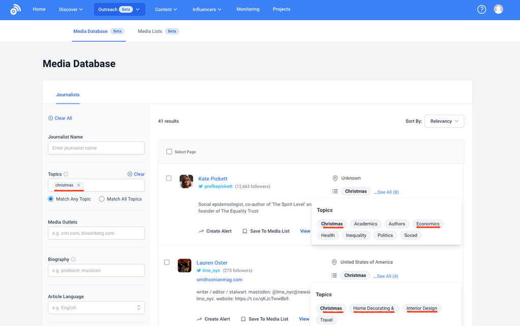 BuzzSumo இன் மீடியா டேட்டாபேஸ், கிறிஸ்துமஸ், நிதி மற்றும் உள்துறை வடிவமைப்பு பற்றி எழுதும் பத்திரிகையாளர்களைக் காண்பிக்கும்