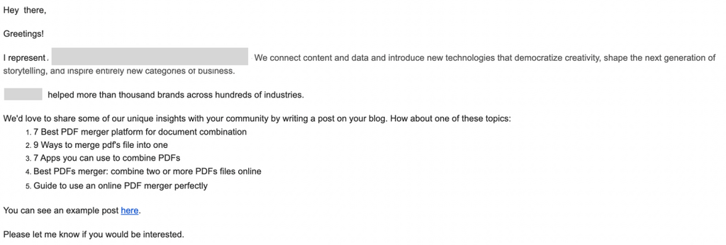 இந்த உத்தி தங்களைத் தாங்களே அழைத்துக் கொண்ட எவருடனும் சேர்ந்து நிழலுக்குத் திரும்பியது என்று நினைத்தேன். “பிளாக்ஹாட் எஸ்சிஓக்கள்” ஒரு தசாப்தத்திற்கு முன்பு, ஆனால் ஃப்ராக்ட்ல் கூட சமீபத்தில் இந்த மின்னஞ்சல்களில் ஒரு பெரிய எழுச்சியைக் கண்டது: