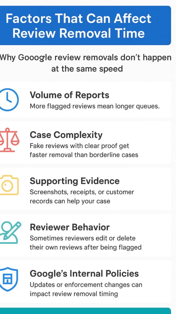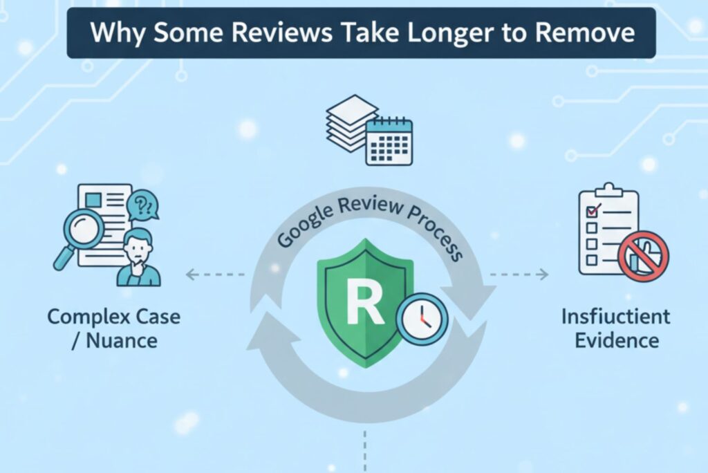 - Case complexity: Fake reviews with clear proof get faster removal than borderline cases.